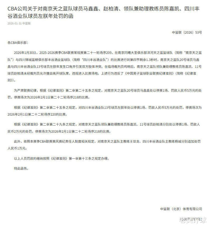 第二个消息,CBA公司官方宣布了罚单,在1月30日南京同曦男篮和四川丰谷酒业男篮那场比赛的冲突,马鑫鑫和左朕年发生肢体冲突。值得注意的是,同曦领队兼助教陈嘉凯和赵柏清进入比赛场地,违反规则。